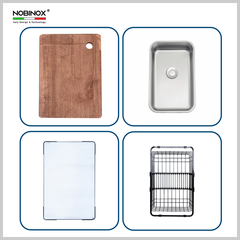 ✅ Phụ kiện đi kèm: thớt gỗ, thớt inox, khay LK, rổ JL