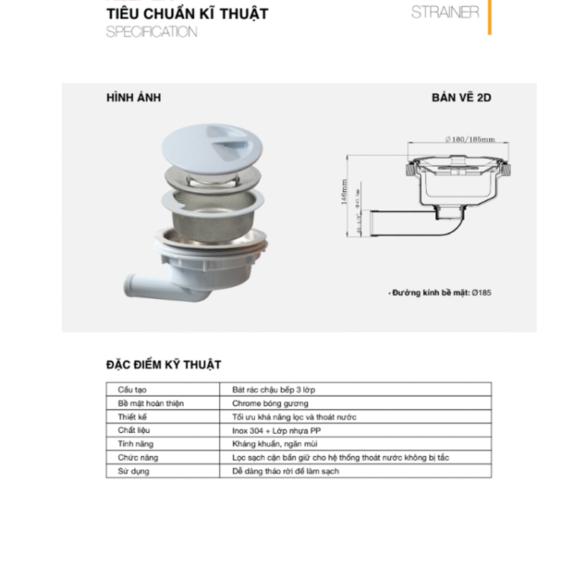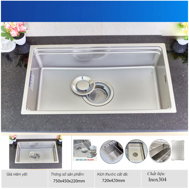 | Phụ kiện đi kèm | Xiphon, rổ inox, thớt inox, chậu nhỏ inox, rổ phụ inox |